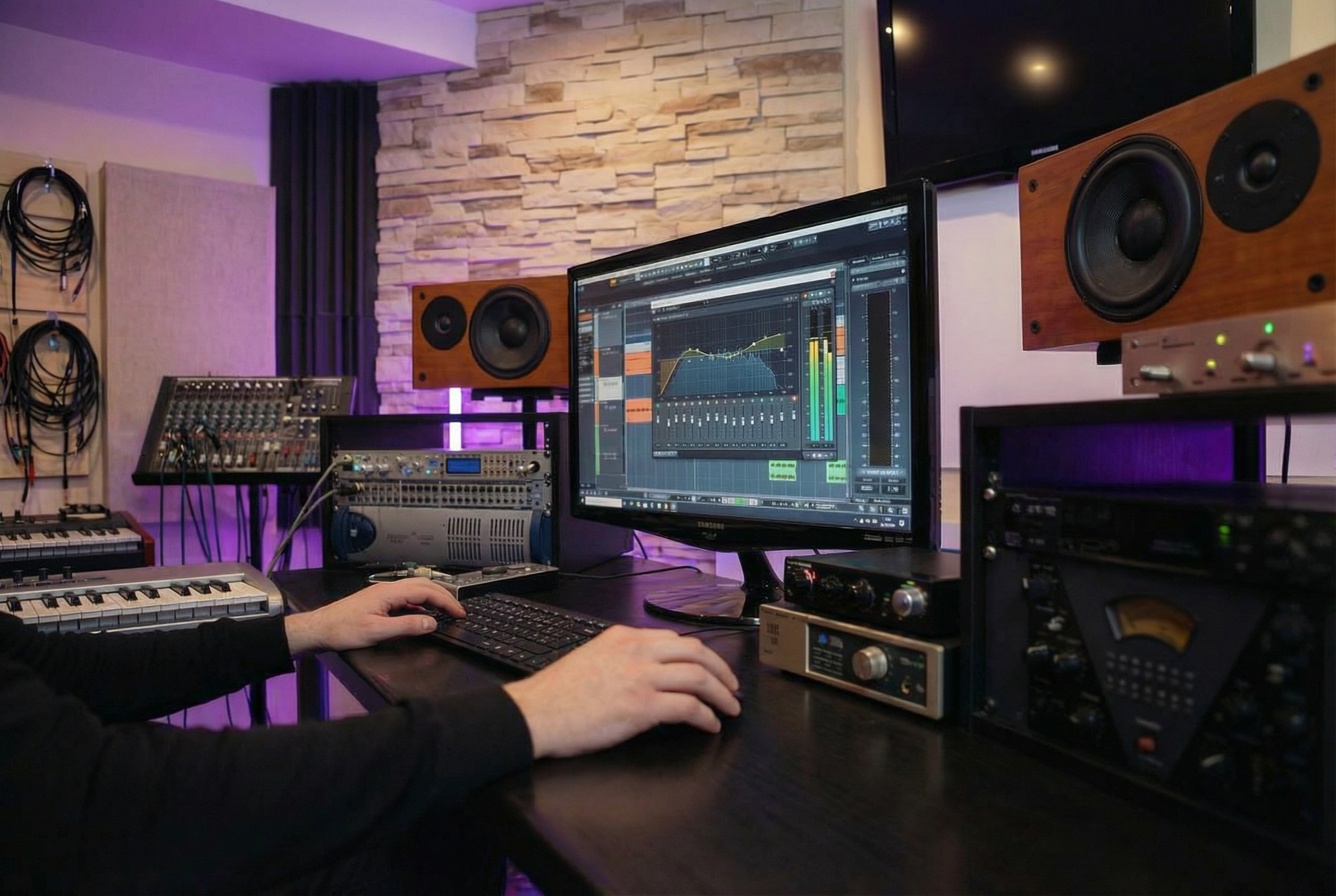 Распределение звуков в стереополе помогает избежать "скученности". Например, ритм-гитара может быть слева, а клавишные — справа.